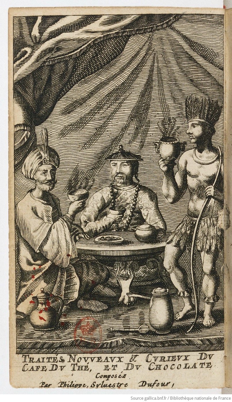 Pour terminer cette première partie, Perrot évoque l’influence naturelle du XVIe siècle et celle des découvertes des grands navigateurs, qu’il illustre par cette gravure du Traités nouveaux et curieux du café, du thé et du chocolat, de Sylvestre Dufour. « Les grands voyages de Christophe Colomb à qui l’on doit la découverte des Antilles, en 1492, de Vasco de Gama et de leurs émules fournissent aux commentateurs l’occasion de signaler des drogues nouvelles dont le nombre va s’augmenter rapidement.