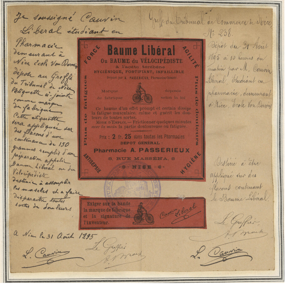 et l’étudiant en pharmacie de Nice, Couvin Libéral, dépose le « Baume Libéral ou Baume du vélocipédiste à l’acéto térébène, hygiènique, fortifiant, infaillible » !