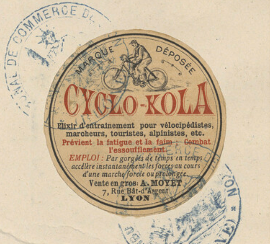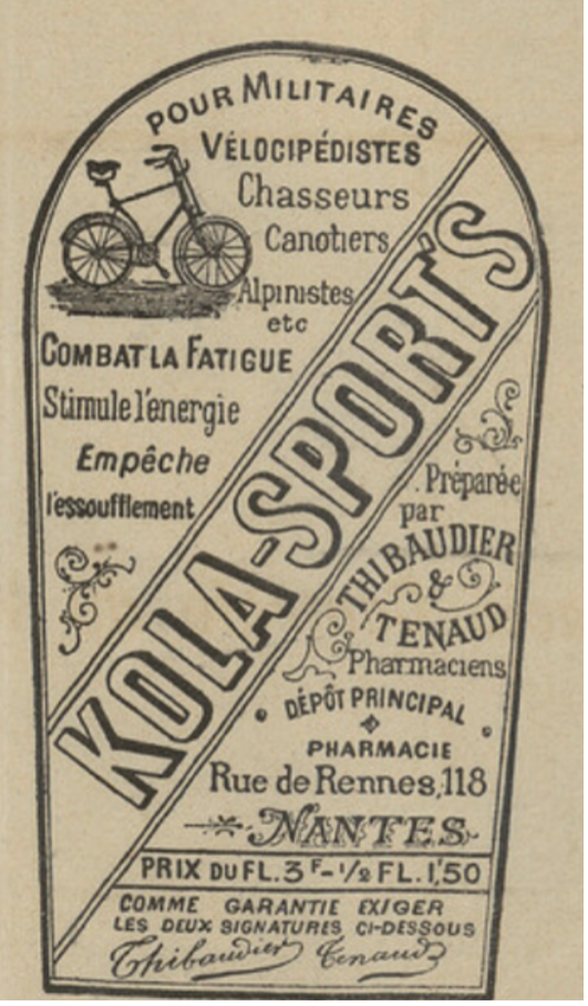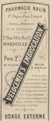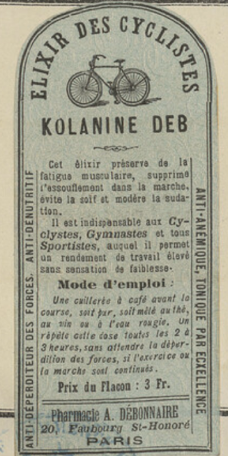 Pour le Baume de sportsmen, Renard précise à son tour qu’il est indispensable aux velocemens, militaires, touristes, chasseurs et tous amateurs de Sport, pour entretenir la souplesse des muscles, éviter la fatigue, prévenir et guérir les ampoules, inflammations et blessures causées par tous les exercices du corps. Un autre pharmacien parisien, Bengué, installé 34 rue La Bruyère, dépose la marque « Kola Cycle » en 1893. La même année, le fameux Ange François Mariani (1838-1914) sort aussi le « VeloCoca Mariani ».