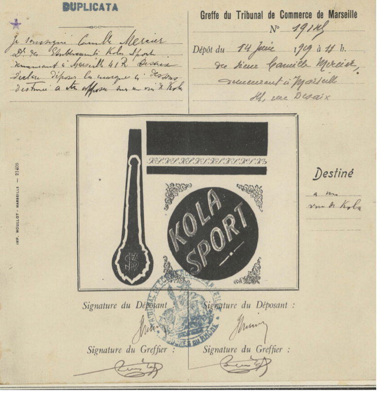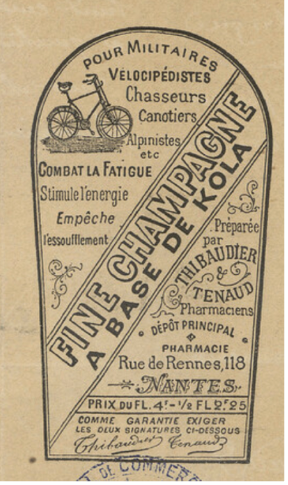 Il y a eu tout d’abord toute une série de dépôt de marque en 1892. Le premier déposant fut un pharmacien d’Arras, Charles Bureau fils, suivi le lendemain 16 juin par plusieurs dépôts de Tenaud pour la Société Thubaudier et Tenaud créée par deux pharmaciens à Nantes. Il s’agit de la marque Kola-Sports et de la Fine Champagne à base de Kola.