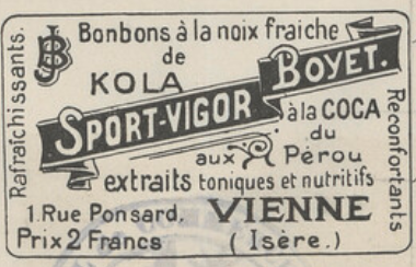 et que deux négociant de Frontignan déposent la marque « Kola-Football » (destinée à une liqueur apéritive). Pour la première fois, on évoque un autre sport que le cyclisme ! En 1904 également, un pharmacien de Vienne, Johannes Boyet, dépose la marque « Sport-Victor-Boyet » pour des bonbons à la noix fraîche de Kola, à la Coca du Pérou. Un autre pharmacien, de Tournon, Georges Brandon, dépose « Block Sport, Bloc Sport, Bloch Sport et Bloq Sport, toujours en 1904.