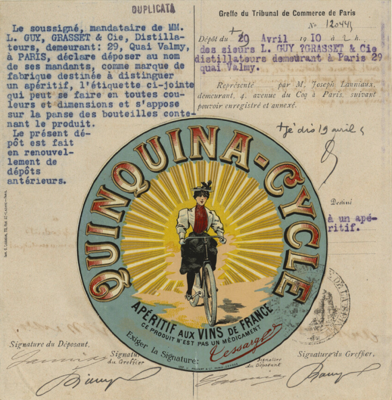 Plusieurs marques d’apéritifs vont sortir en 1910 et 1911 : Quiquina-Cycle, du distillateur de Paris L. Guy Grasset et Cie, St-Raphaël Quinquina-Sport, St-Raphaël Sport, Raphaël Sport, et la « Liqueur du Vélocemen » du fabriquant de produits pharmaceutiques Maurice Robin. On trouve également en 1911 « le Cycle » du distillateur de Nice A. Casiglia. En 1913 sont publiées les marques « Marathon (Tablets) » et « Marathon (Pills) » du pharmacien du Mans Arthur Pottier. Toujours en 1913, Fernand Duvallet, de Paris prend les marques « Athletic-Embrocation », « Gladiateur-Embrocation » et « Elixir-Athlétic ».