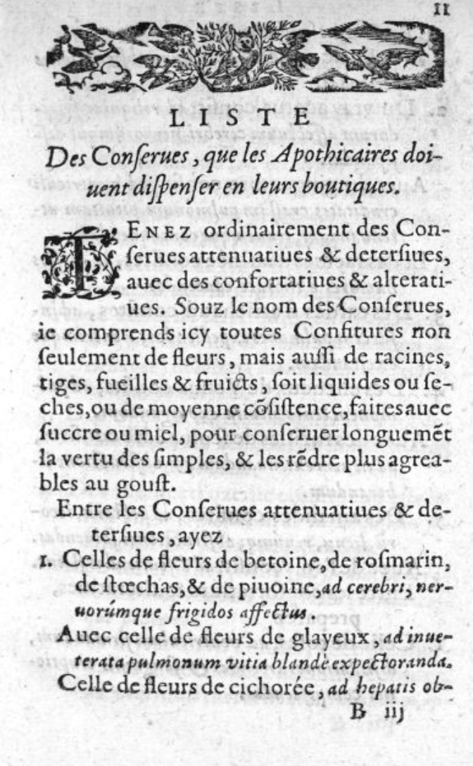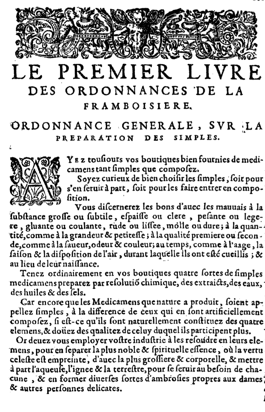 Plus loin, on trouve la liste des compositions que les apothicaires doivent dispenser ordinairement : conserves, sirops, électuaires, pilules, trochisques (qui sont des compositions internes), baumes, onguents et emplâtres (qui sont les externes). Chaque préparation est décrite très méthodiquement. Par exemple, La Framboisière explique la façon de faire les conserves purgatives à base de fleurs de pêcher, de pruniers sauvages et de centaurée : « Choisissez premièrement un pot de verre commode : faites y un lit de sucre en poudre, d’un doigt de haut, et par dessus un lit de fleurs de pêcher, de même épaisseur ; puis un autre lit de sucre : après un lit de felurs : conséquemment un de sucre, et encore un autre de fleurs au dessus, et enfin un de sucre pour couvrir les fleurs. A partir de là, fermer bien le vaisseau avec du parchemin, et le tenez un mois au soleil. Préparez de la même façon la conserve de fleurs de prunier sauvage, et celle des fleurs de la petite centaurée. »