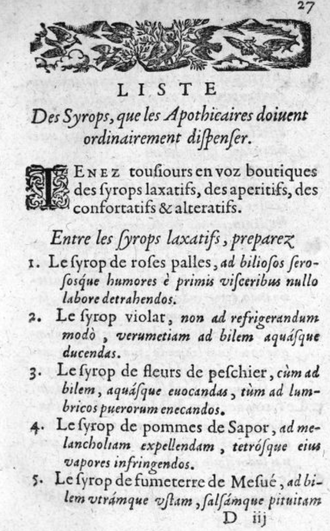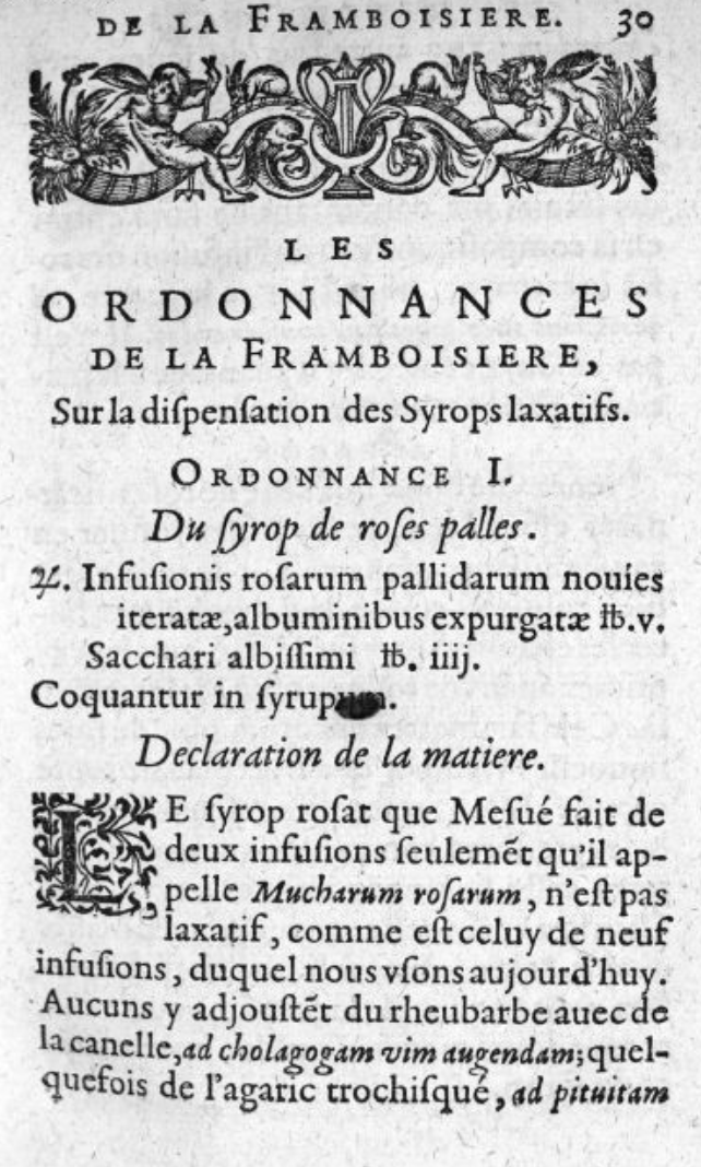 La Framboisière s’intéresse également aux sirops et fait la liste des sirops préparés par les apothicaires, comme ici les sirops laxatifs : sirop de roses pâles, sirop violat, etc. Là encore, l’auteur rentre dans le détail des opérations pharmaceutiques.