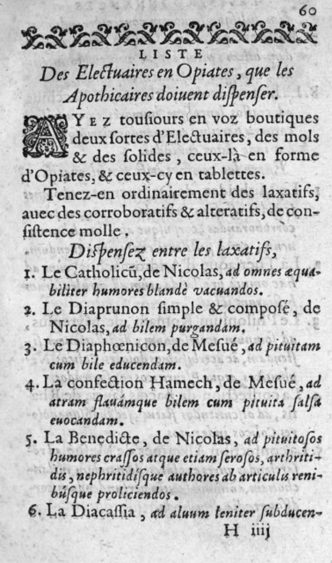 Après avoir examiné la composition des miels, Robs et Lochs, une partie importante du texte concerne les électuaires, « jadis nommés Antidotes par les Grecs. Ce sont des poudres incorporées avec miel ou sucre. De là vient qu’il y en a deux sortes : des mous en consistance d’opiat, des solides en forme de tablette. » La Framboisière poursuit : « pour préparer un électuaire mou, faites cuire doucement le miel sur le feu avec un peu d’eau, et l’écumez. Quand il sera bien purifié, retirez le du feu, et étant tiède, y jetez petit à petit les poudres, en les remuant toujours avec un pilon de bois, pour bien le mêler. Quand la confection sera entièrement refroidie, mettez la dans une boite, n’étant pas trop liquide, ni solide, afin que l’action mutuelle des ingrédients, la fermentation, se fasse mieux. » L’auteur fait ensuite une liste des « électuaires en opiat que les apothicaires doivent dispenser. « On retrouve dans cette liste le Catholicum de Nicolas, la Confection de Hamech de Mésué, la Bénédicte de Nicolas, etc. mais aussi le Mithridate de Damocrates et la Thériaque d’Andromaque, ou encore la Confection d’Alkermès.
