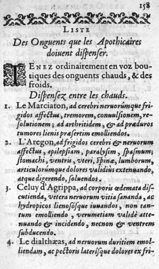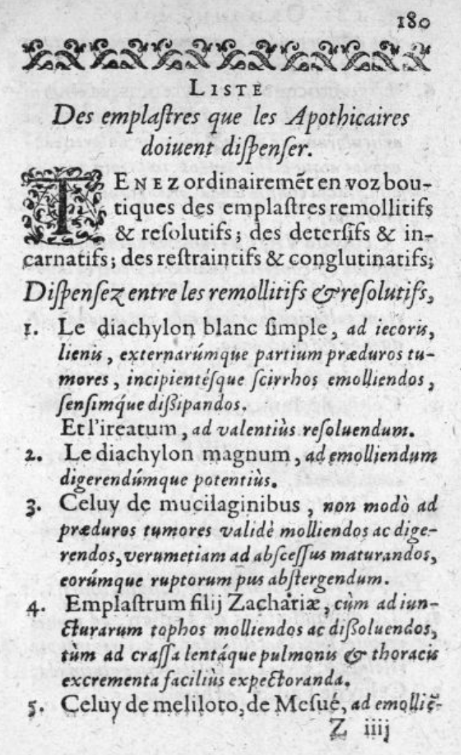 La Framboisière poursuit son volumineux ouvrage par la description des pilules, trochisques, huiles… et arrivent aux onguents et aux emplâtres. Comme pour les autres formes, il liste d’abord les onguents que les apothicaires doivent dispenser comme l’onguent d’Agrippa, le Marciaton, l’Aregon, etc. On peut examiner l’exemple de l’onguent égyptien de Mesué. « L’onguent appelé Egyptae, pour sa couleur basanée comme celle des Egyptiens, reçoit le miel, le verdet et le vinaigre… ».