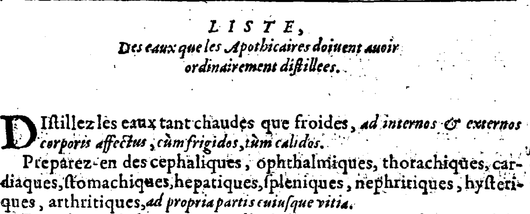 Le chapitre suivant est consacré aux eaux distillées. A la fin, l’auteur donne une liste des eaux que les apothicaires doivent avoir en leur boutique, il les classe d’après leurs vertus : encéphaliques, ophthalmiques, thoraciques, cardiaques, stomachiques, hépatiques, spléniques, néphrétiques, hystériques, arthritiques, etc. A propos du corail et des perles, voici ce que recommande La Framboisière : « Vous pilerez grossièrement le corail rouge, et vous le ferez dissoudre au bain marie, avec du suc de limons, ou de berbéris bien dépuré. Mais vous mettrez au feu les perles toutes entières,et les éteindrez plusieurs fois dans eau de vie, puis les dissoudrez au suc de limons, ou de berberis clarifié, ou bien au vinaigre alcalisé ou miellé, lequel vous séparerez après leur dissolution…. » La Framboisière poursuite par la préparation des huiles « tirées des simples », comme l’huile d’olive obtenu par expression, ou l’huile de cannelle, par distillation.