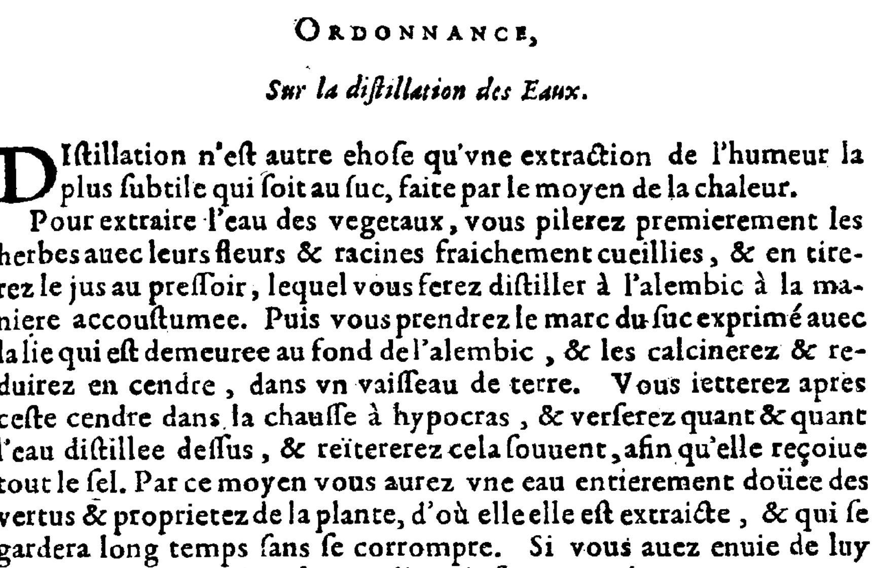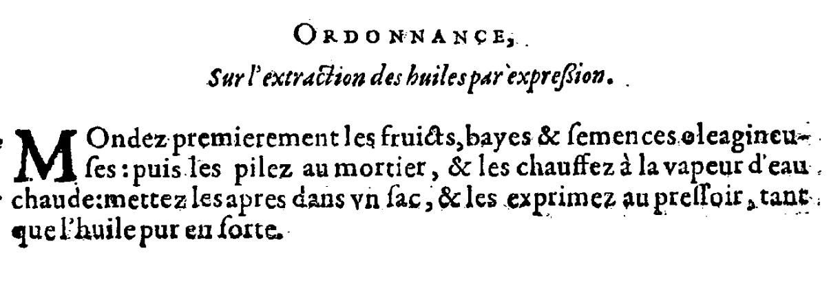 A titre d’exemple, voici ce que dit La Framboisière à propose de l’extrait de Séné (retraduit en terme moderne) : « Prenez une demie-livre de Séné Oriental, avec une demie-once d’anis. Laissez les tremper et digérer au bain-marie, en eau de pommes odoriférantes, rendue aigrette avec l’esprit acide de vitriol ou de soufre. Après que l’eau sera teinte en couleur de rubis, vous la séparerez par l’inclinaison et mettrez encore autant de Séné et d’anis infusés dedans. Puis versez l’infusion dans un alambic de verre, et en distillez l’eau par chaleur humide. Cela fait, vous apercevrez la pure essence de Séné au fond, en consistance de miel. »