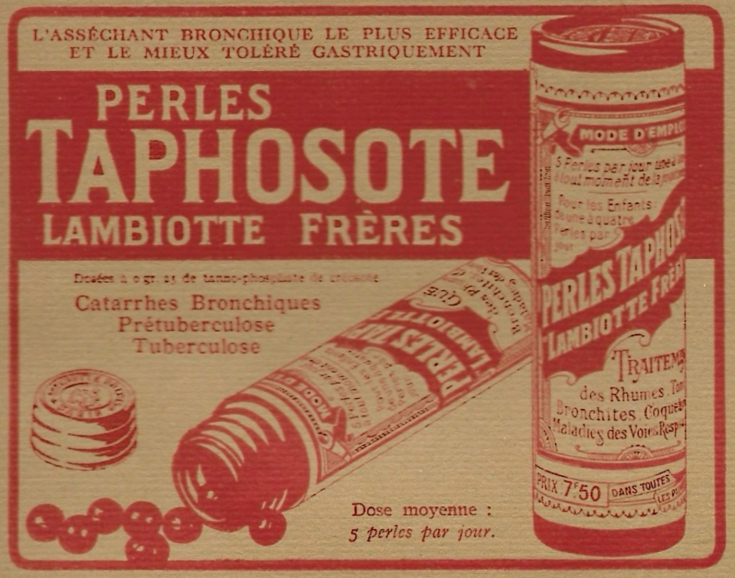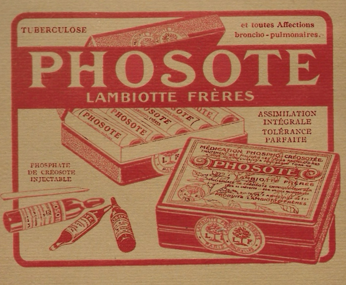 La plupart des produits Lambiotte était basée sur le créosote (substance extraite des goudrons de bois) et ses dérivés. Cette classe de médicaments est progressivement supplantée par des produits issus de la chimie de synthèse et la division pharmaceutique cesse son activité à la Libération. Le Phosote injectable était du « phosphate de créosote pur » et le Taphosote , présenté sous forme de perles, était un « tanno-phosphate de créosote ».