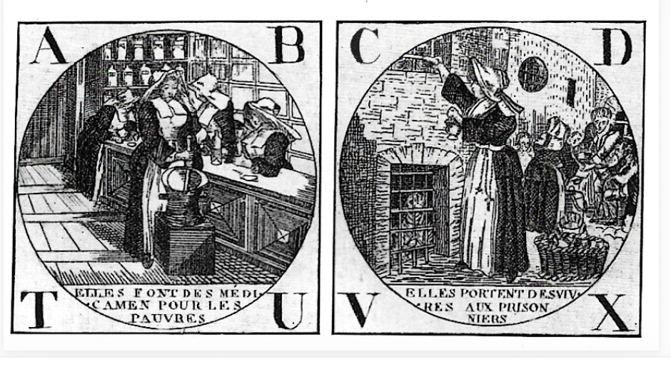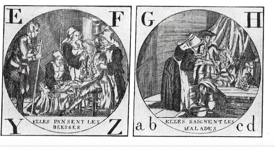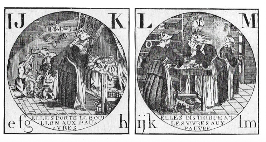 Pour terminer, un autre article est consacré à l’assistance aux pauvres et aux malades dans les campagnes au XVIIIe siècle, par la docteur J. Vinchon. On y trouve une série d’images intitulée « Abé Cédé dédié aux vertus admirables des Soeurs de la Charité pour les soins et le soulagement qu’elles portent aux pauvres orphelins et aux malades » dont voici quelques exemples. L’auteur de l’article indique qu’au XVIIIe siècle, « les paysans souffraient surtout de la misère et de la maladie. Les économistes s’en alarmaient ; le roi, sur l’initiative de Turgot, essayait de les combattre par ses ordonnances.