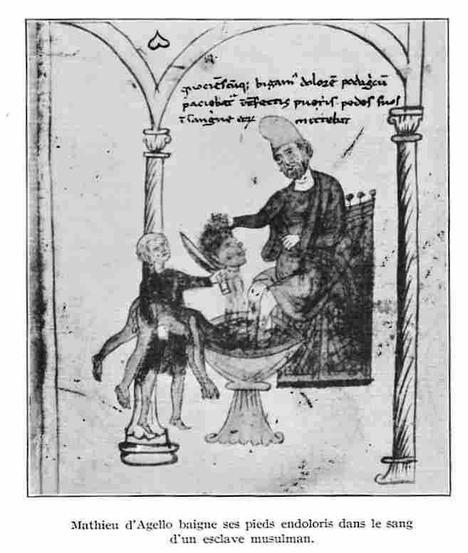 On voit ci contre un dessin de Pierre d’Eboli représentant Mathieu d’Agello qui baigne ses pieds endoloris dans le sang d’un esclave musulman.