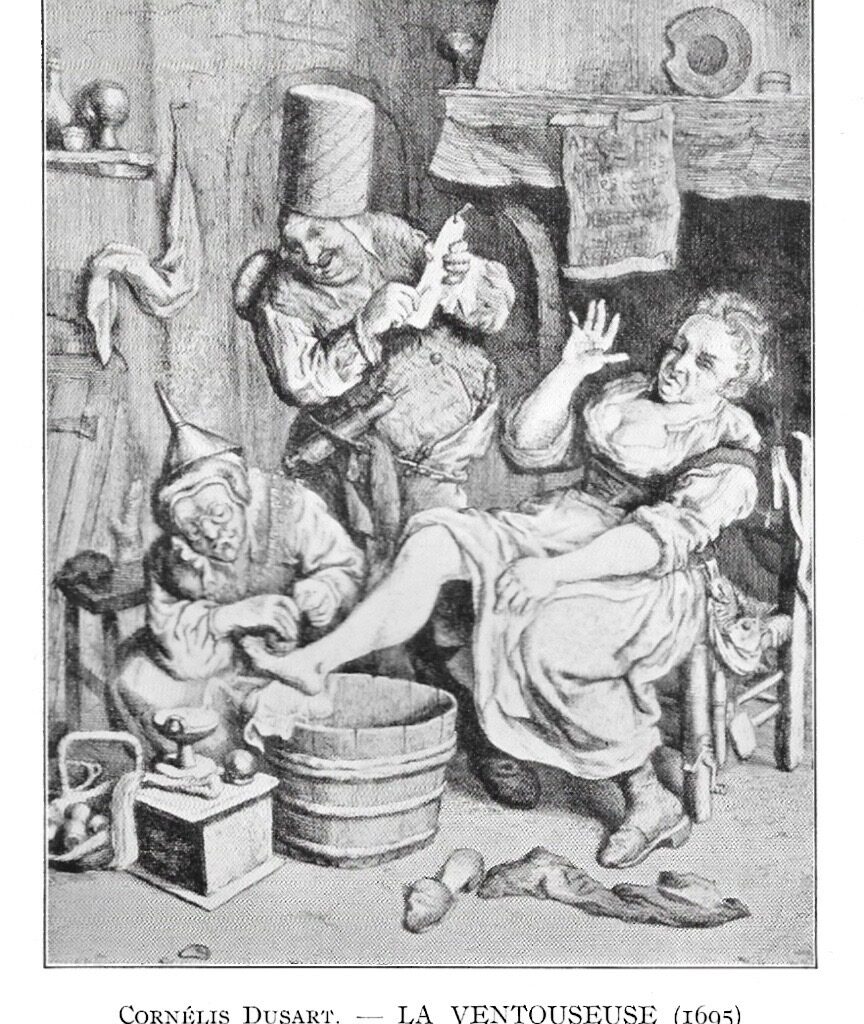 Il a une seringue passée à la ceinture et contemple la scène tout en aiguisant sa lancette. On voit donc réunis les trois auxiliaires indispensables du médecin au XVIIe siècle : la ventouse, la seringue à clystère et la saignée.